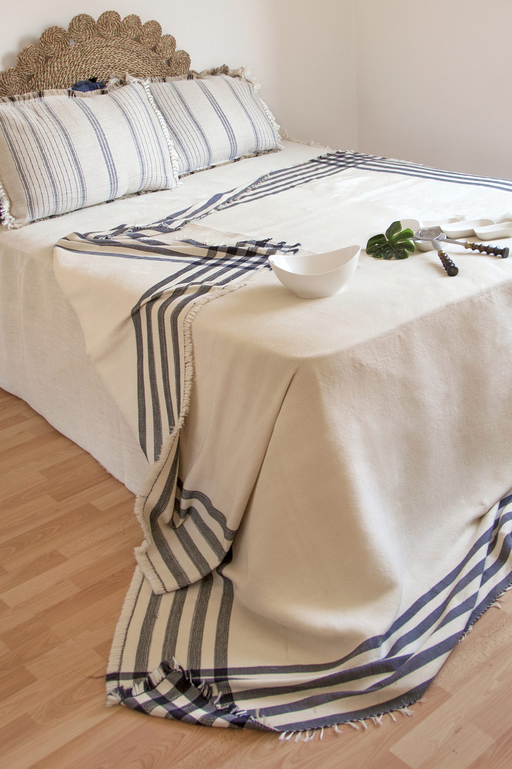 100% natural linen & Cotton bed cover. Carefully hand-weaved on a foot pedal loom by artisans in Upper Egypt. Soft, lustrous Linen & Cotton yarns are hand-tufted to create contrasting textures.