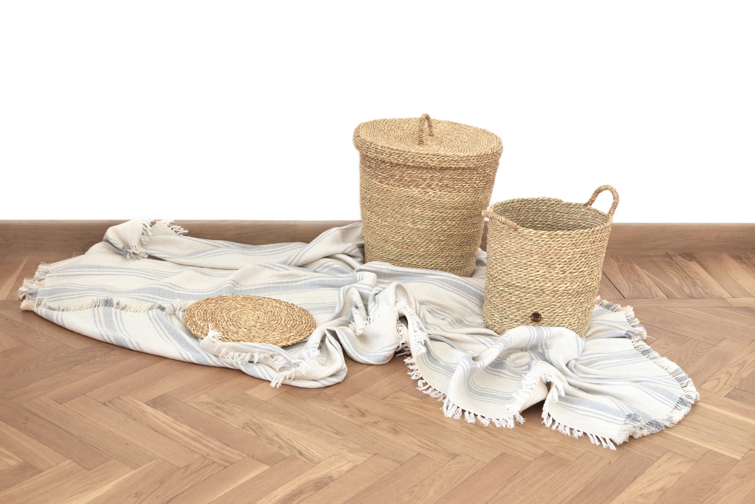 Cylindrical laundry basket in braided sea grass with a cover. Lined with a bag in ecru cotton canvas that has a drawstring at the top for easy closure when the basket is full.