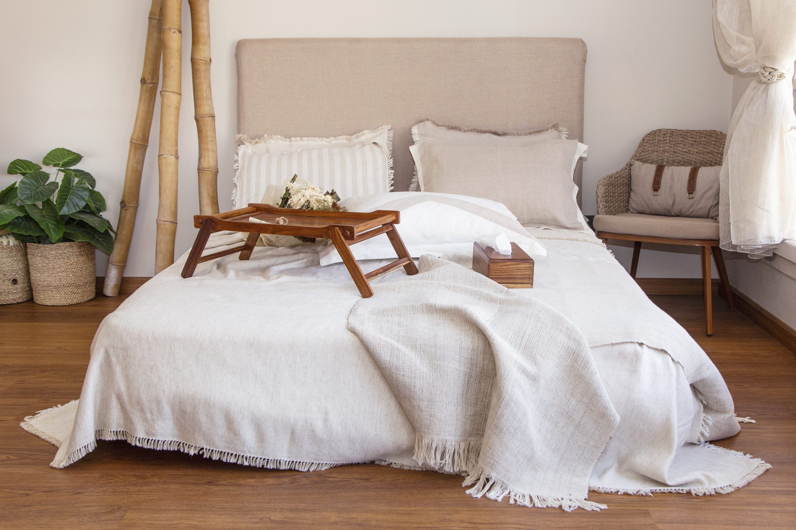 100% natural linen & Cotton bed cover. Carefully hand-weaved on a foot pedal loom by artisans in Upper Egypt. Soft, lustrous Linen & Cotton yarns are hand-tufted to create contrasting textures.