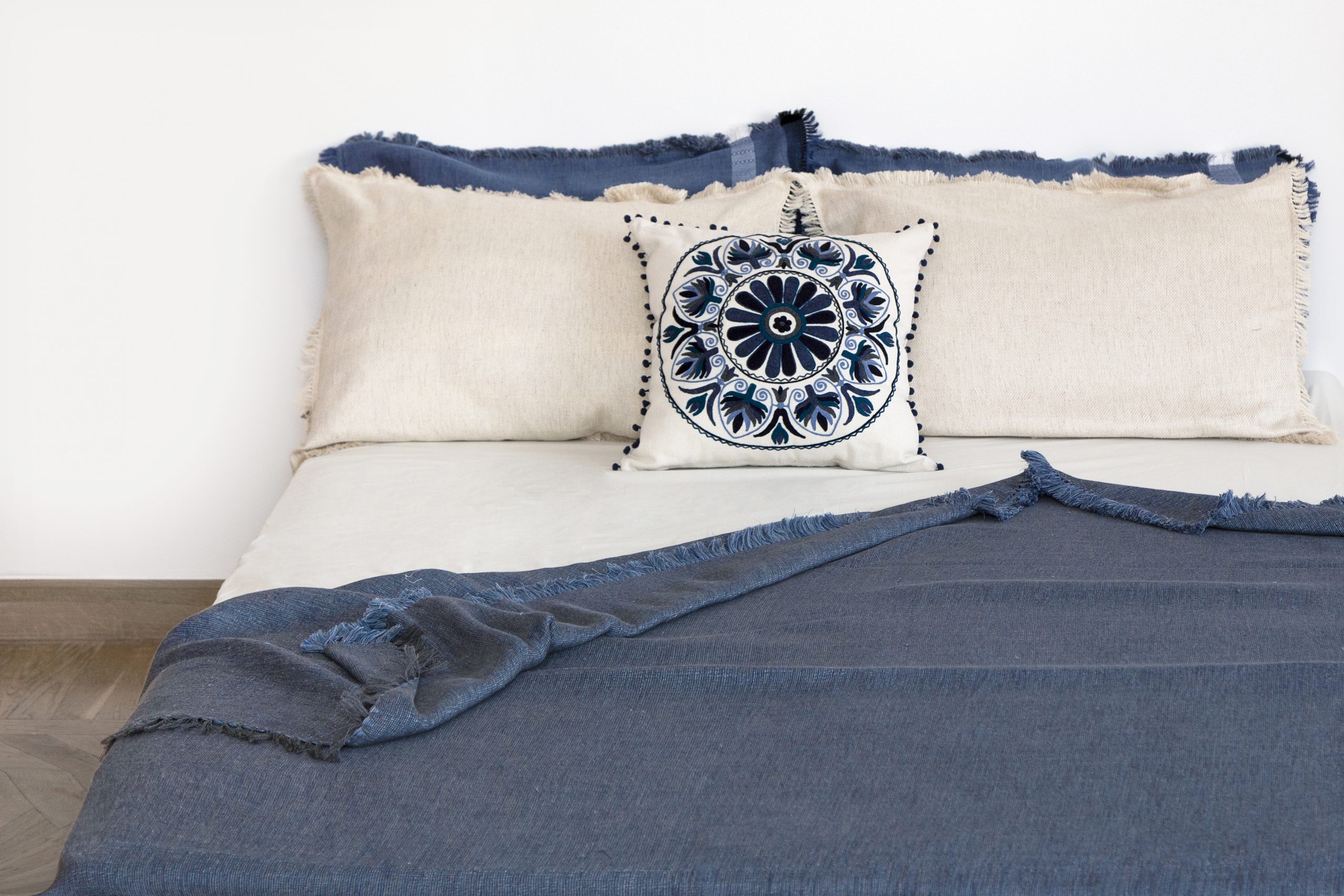 100% natural linen & Cotton bed cover. Carefully hand-weaved on a foot pedal loom by artisans in Upper Egypt. Soft, lustrous Linen & Cotton yarns are hand-tufted to create contrasting textures.